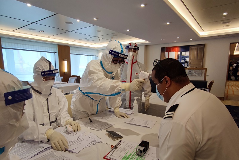 图为:关员对“维京太阳”号船员开展流行病学调查 王亚芬/摄