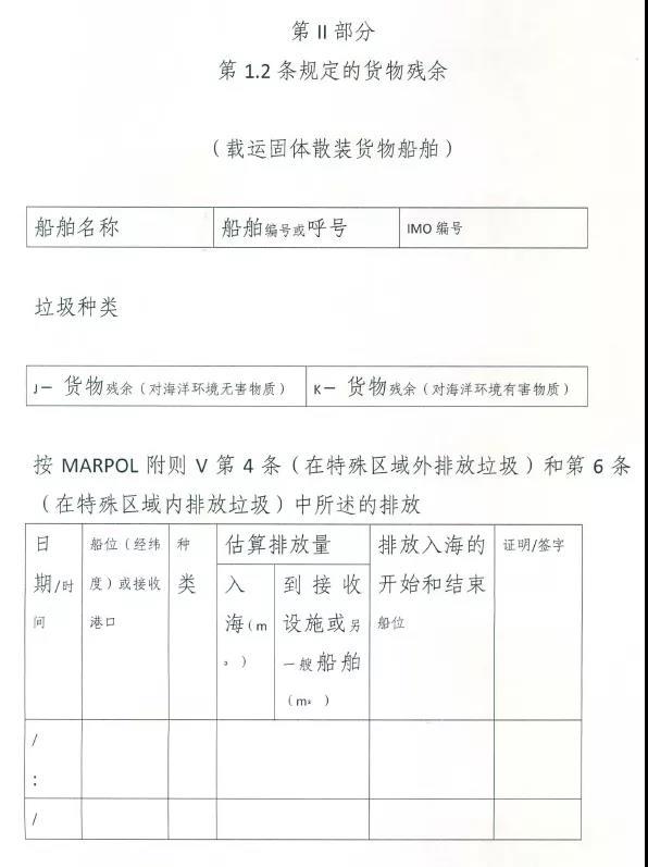 也即是说,货物残余作为船舶垃圾的一部分,其排放和收集应严格遵守公约和其他法律法规的要求,船员在处理完货物残余后,应该严格按照公约要求在《垃圾记录簿》第‖部分中及时记录,格式如下图: