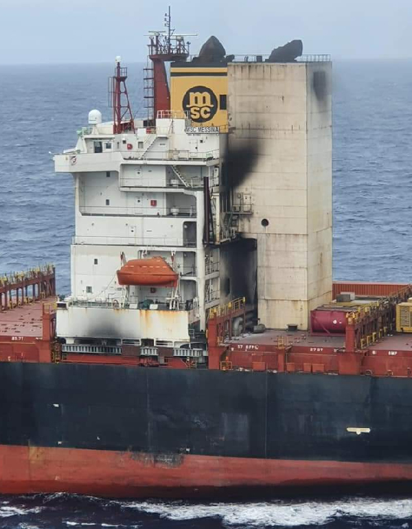 据美国知名海事媒体Maritime-executive报道,6月24日,MSC Messina轮空载航行至斯里兰卡和马六甲海峡之间距布莱尔港 425 海里处机舱突发火灾,但随后被船员自行扑灭。印度海岸警卫队的照片显示,船上有明显的的起火痕迹,生活区墙面已被浓烟熏黑。另有报道称,火灾发生后MSC Messina轮已失去动力。