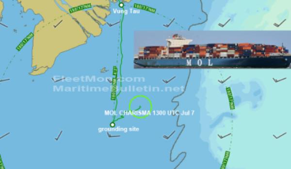 7月5日18:00左右,MOL CHARISMA轮航行至头顿以南约 180 海里附近海域时搁浅。事发当时这艘大型集装箱船正从越南头顿(Vung Tau)港去往下一港口新加坡港。