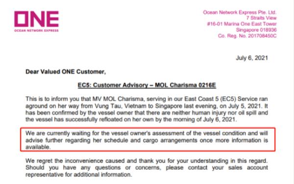 目前,船公司ONE已经向客户发出事故告知函,但关于此次事故对于后续船期的影响,ONE表示“正在等待船东对船舶状况的评估,以便确认下一步船期及船上货物的安排”。