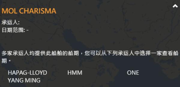 来自大船期的最新信息显示, MOL CHARISMA轮被ONE部署在亚洲至美东航线EC5。除ONE,共舱船公司还有THE联盟的赫伯罗特,阳明海运和现代商船(HMM)。