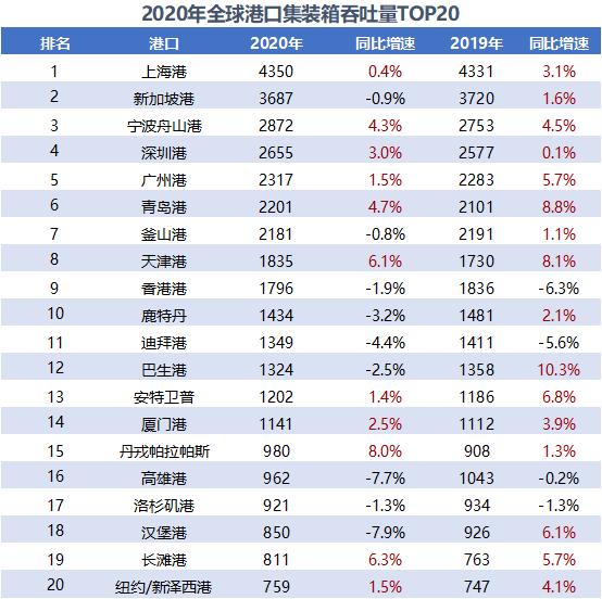 从整体来看,预计2021年全球前20大集装箱港口与2020年变化不大,港口排名发生变化的具体情况如下:美国洛杉矶港将超过中国高雄港,位列全球第16位,高雄港退居第17位;美国长滩港将超过德国汉堡港,位列全球第18位,汉堡港退居第19位。