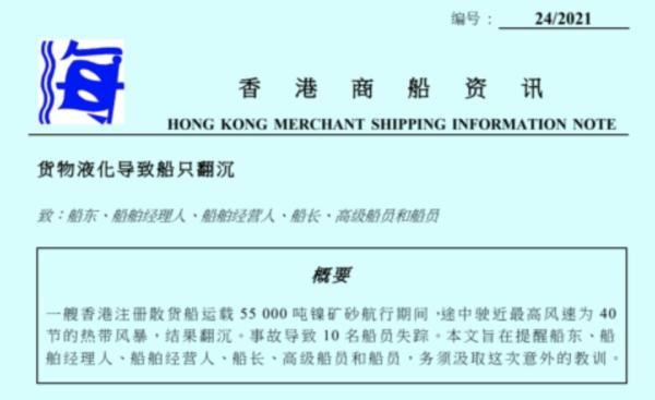 以下是香港海事处2021年7月20日发的商船资讯(编号24/2021),业内人士透露该事故发生于2017年,该业内人士又称近期没有任何船能从印尼拉镍矿出来,该国2020年1月后禁止镍矿原矿出口。