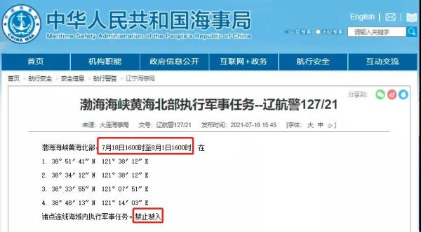 据大连海事局 :渤海,7月21日0800时至29日1800时,在