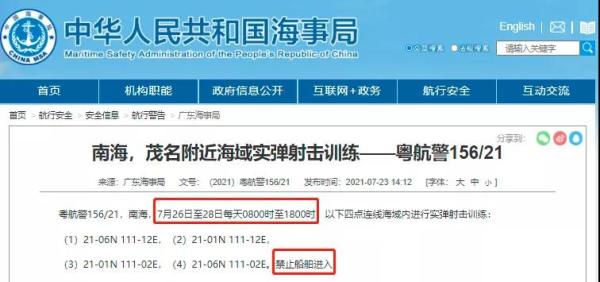 二、南海,茂名附近海域实弹射击训练--粤航警156/21