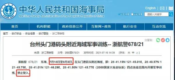 据浙江海事局消息,浙航警678/21,东海,7月18日至8月3日,头门港码头附近海域,即: