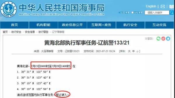 据大连海事局消息,辽航警133/21,黄海北部,7月23日0600时至7月29日1400时,在