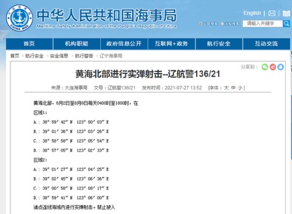 据中国海事局,黄海北部,8月2日至8月8日每天0400时至1800时,在