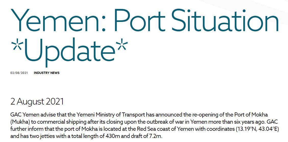 近日,GAC也门告知,也门交通运输部已宣布在六年多前因战争爆发而关闭的摩卡港(Mukha)重新开放。