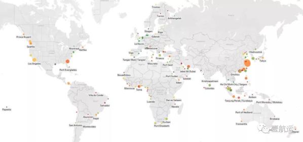 尽管宁波和上海停泊的船舶数量最多,但全球集装箱港口的拥堵情况似乎越来越严重,如下图所示,由eeSea编制的地图显示,这些气泡表明船舶在五大洲后撤。