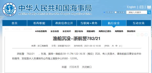 事发后, 浙江省海上搜救中心立即启动搜救应急预案,迅速调派海事、渔政、海警、东海救等7艘公务执法和专业救助船艇前往事发水域实施搜救,并协调组织附近30余艘船舶开展搜救,同时播发航行警告,发布安全通播,对事发水域实施临时交通管制。