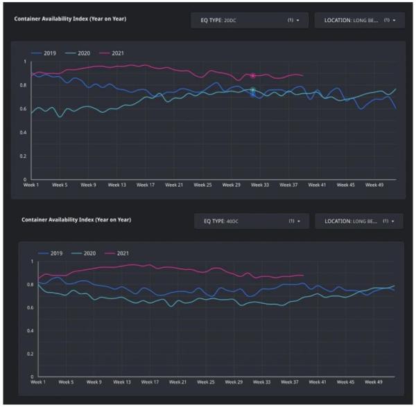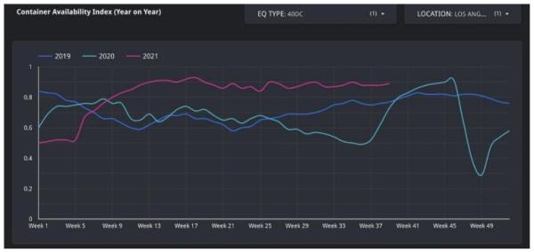 由于零售商在假日季节前备货,高进口水平导致拥堵加剧。上图显示了过去三年入境集装箱与出境集装箱的CAx同比趋势。与2020年同期相比,2021年8月的CAx值平均增加了60%。这表明洛杉矶港的入港集装箱比去年同期增长了60%。