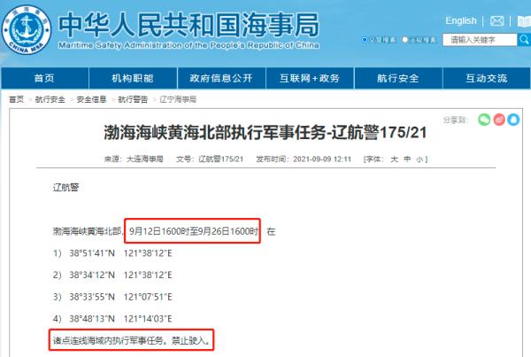 据大连海事局 :渤海海峡黄海北部, 9月12日1600时至9月26日1600时,在
