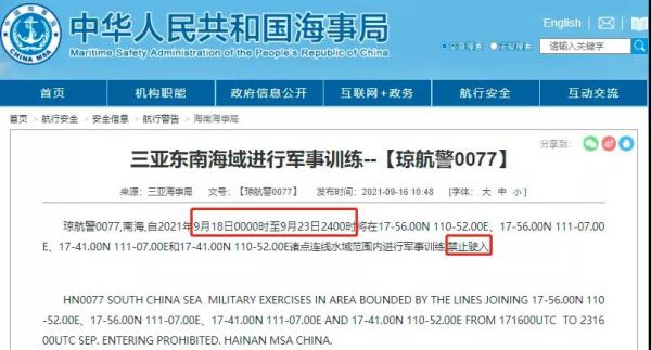据三亚海事局消息,琼航警0077,南海,自2021年9月18日0000时至9月23日2400时,将在: