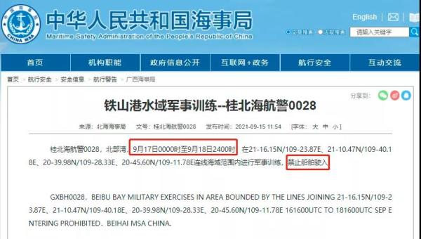 据北海海事局消息,桂北海航警0028,北部湾,9月17日0000时至9月18日2400时,在