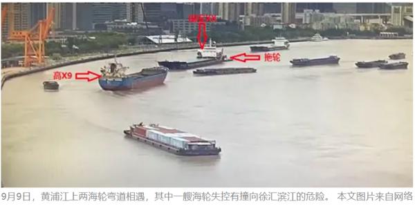 9月9日,黄浦江上两海轮弯道相遇,其中一艘海轮失控有撞向徐汇滨江的危险。 本文图片来自网络