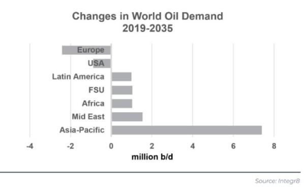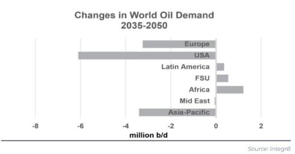 在这一较长时期内,一些地区的石油需求预计仍将增长,但亚太、美国和欧洲在 "环境模式 "中的主导地位将远远超过这些其他地区的发展,全球石油需求最终将萎缩。
