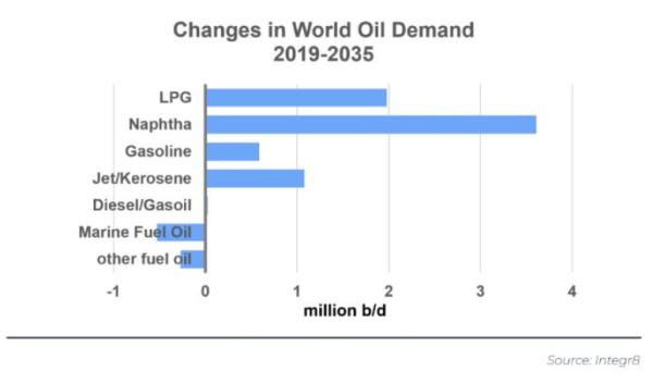 然而,向电动汽车(EVs)的结构性变化预计将 "启动",汽油和柴油需求将出现逆转,全球汽油将减少约700万桶/日(减少25%),柴油将减少300万桶/日(减少10%)。随着飞机效率的提高和生物燃料的使用,喷气燃料的需求预计也将下降。