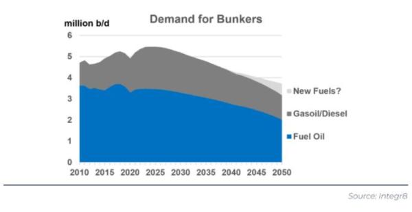 关于燃油市场的总规模有各种数据,Integr8 Fuels数据分析显示所有船舶的燃油市场规模约为2.75亿吨/年(500万桶/日)。国际海事组织最近公布了5000总吨以上的船舶的燃料市场规模,约为每年2.13亿吨。随着国际海事组织的立法,加上政治压力及来自航运用户更严格的环境要求,航运业实现环境目标的需求是显而易见的。虽然有关于替代燃料的讨论,但到2050年,"传统 "化石燃料仍可能在航运业中占主导地位。这意味着将不得不实现更高的效率(在短期内老旧船舶的慢速航行和长期的技术进步)。船用燃油市场的规模预计将从目前的每年约2.75亿吨下降,到2035年可能达到约2.5亿吨,到2050年可能达到1.75-2亿吨。