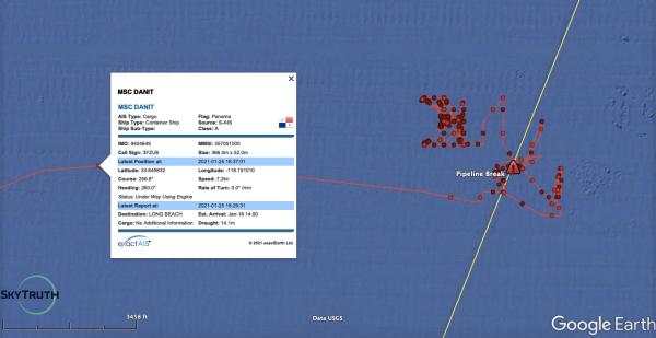 根据南加州 VTS 服务海洋交易所发布的信息,1月25日,该地区风速为 30-55 节,海浪高达 17 英尺。在风暴前停泊的 50 多艘船舶中,有 24 艘船舶起锚出海避风。Skytruth 的卫星图像调查人员从 MSC Danit轮获得的AIS数据显示,当时该船曾在“锚定”时“反复穿过”受损的管道。