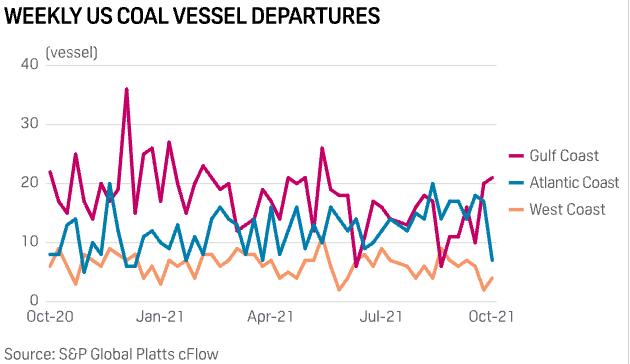 虽然从墨西哥湾和西海岸出发的船只比前一周有所增加,但从大西洋海岸出发的煤船数量却骤减。