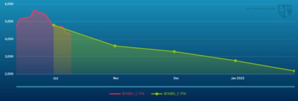 在10月中旬,当BDI一路下滑之际,考虑到 "不正常 "的情况,小型船舶的远期租金预期实际上超过了大型海岬型船的预期。根据2022年2月的远期运费协议,巴拿马型船预期日租金约为30,000美元/天,而更大的海岬型船仅为不到23,000美元美元/天,而目前海岬型船日租金超过巴拿马型船约5000美元/天。