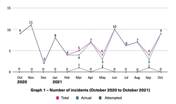 在2021年10月发生的9起事件中,4起事件发生在巴淡岛农沙附近(印度尼西亚),3起事件发生在民丹岛丹戎佩甘附近(印度尼西亚),1起事件发生在尼帕岛附近(印度尼西亚),1起事件发生在马来西亚东柔佛州丹戎布拉特附近。