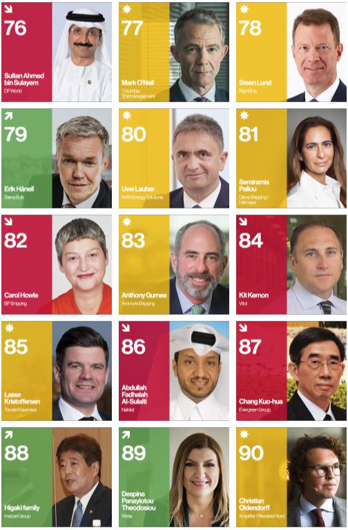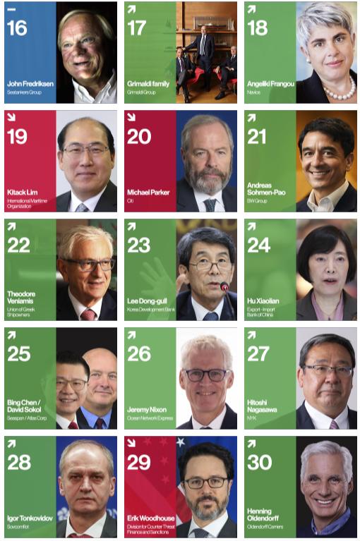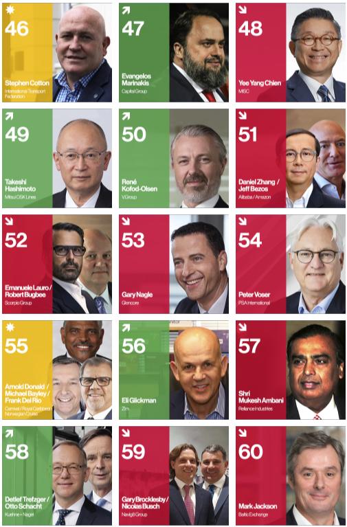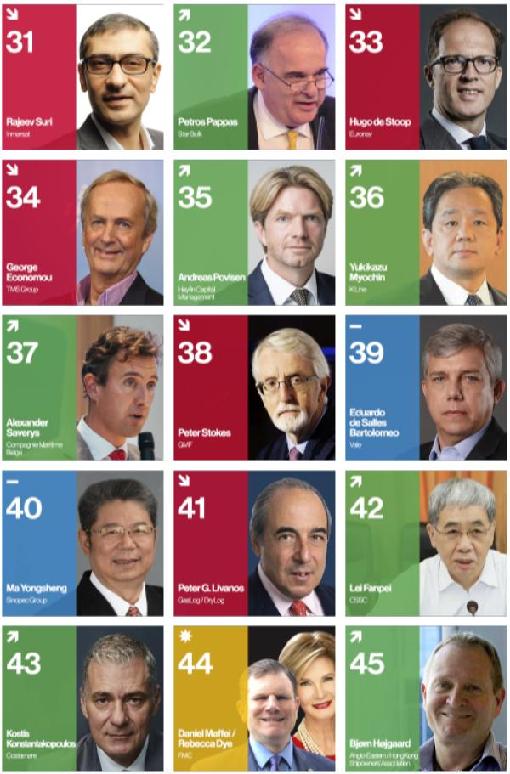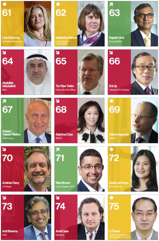 此外,榜单上其他的中国面孔分别为并列第11的交银租赁董事长赵炯与工银金融租赁董事长张正华,第24的中国进出口银行董事长胡晓炼,第25的Seaspan董事长陈兵,第40的中石化董事长马永生,第42的中国船舶集团有限公司董事长雷凡培,并列第51的阿里巴巴集团董事局主席、首席执行官张勇,第68的波罗的海国际航运公会主席赵式明,第75的交通运输部总工程师、水运局局长李天碧,第87的长荣海运董事张国华。