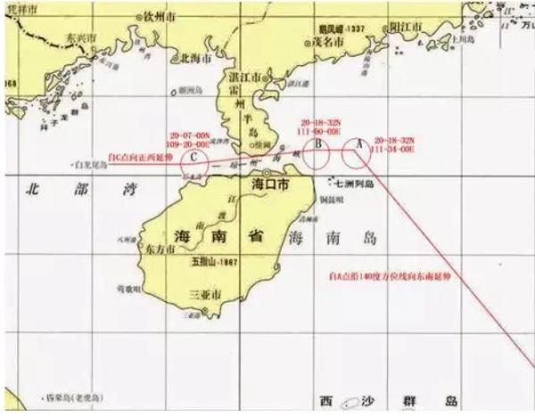 自20°18′32″N/111°34′00″E(北界线的A点)沿140°方位线向东南方向延伸。