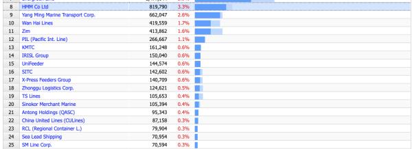 尽管在完成收购后,森罗商船仅持有HMM不到0.5%的股份,但还是引发了有关这两家航运巨头可能合并的猜测。目前,根据Alphaliner的数据,HMM现有运力排名全球第八,达到819790TEU,而森罗商船现有运力则为70594TEU,排名全球第二十五。