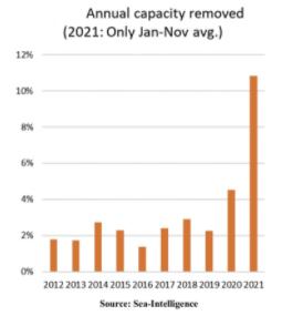 Sea-Intelligence的数据显示,疫情前,通常有2%的集装箱船运力陷入延误,而这一数字在2021年飙升至11%。