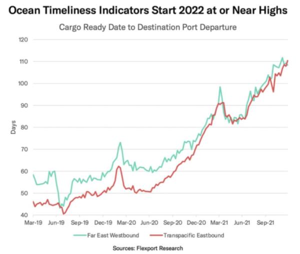 根据Flexport为提供的"海运时效性指标"(Ocean timerindicator),在跨太平洋东行航线上,疫情前从出口商准备好货物到进口商收货所需的时间的平均时间是45至50天,而2022年1月2日的最新指标显示平均时间已达到110天,创下历史新高。