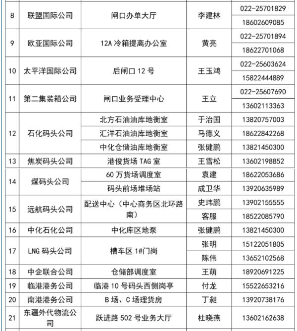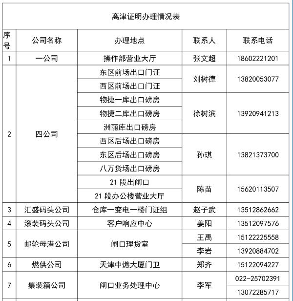 为全面贯彻落实天津市、滨海新区关于疫情防控各项部署要求,切实维护广大客户的利益,进一步提升客户集疏港便利性,对于离津货车司机需在高速公路、普通公路卡口出示“一码两证”(健康码为绿码、48小时内核酸检测阴性证明、离津证明),天津港集团所属各码头公司及堆场物流企业均可为离津客户办理离津证明。各公司离津证明办理点见下表。