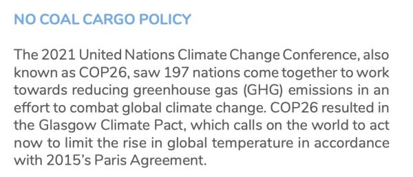 东太平洋航运在最新的《2022ESG政策》中表示:"随着世界向清洁能源解决方案的过渡,逐步减少煤炭的使用将大大降低二氧化碳的排放。为了支持这一转变,由EPS商业管理的船舶将遵循无煤炭货物政策。”
