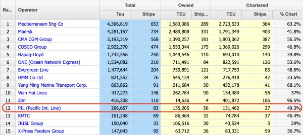VesselsValue数据显示,在海丽凯资本救助之前,太平船务在2020年共出售了24艘船,2021年出售了9艘船,其中两艘是多用途船,一艘为超大型散货船。在出售这些船舶后,太平船务掉出了Alphaliner全球班轮运力排行榜前十。Alphaliner最新数据显示,太平船务排名第十二,现有运力为266667TEU,共运营83艘集装箱船,56艘自有船,27艘租赁船。