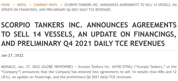 在2021年第四季度财报即将出炉之际,摩纳哥成品油轮船东Scorpio Tankers宣布将出售14艘油轮(2艘MR型和12艘LR1型)以加强其资产负债表,总交易价值为4.72亿美元,预计在2022年上半年完成。
