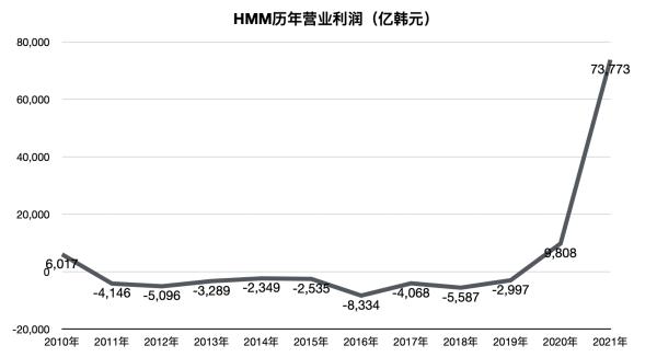 HMM自2010年实现营业利润618亿韩元以来,因航运业长期不景气,连续9年亏损,在2011年-2019年累计经营亏损达3.84万亿韩元(约合204亿人民币)。然而,从 2020 年开始,HMM 得益于航运业的繁荣和引入超大型集装箱船,业绩有所改善,同年实现了 9808 亿韩元(约合52.1亿人民币)的营业利润,实现了首次“扭亏为盈”。