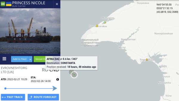 Marinetraffic船舶AIS显示,目前散货船“Afina”轮以及“Princess Nicole”轮均已被转移至克里米亚水域——俄罗斯在黑海的主要海军基地。