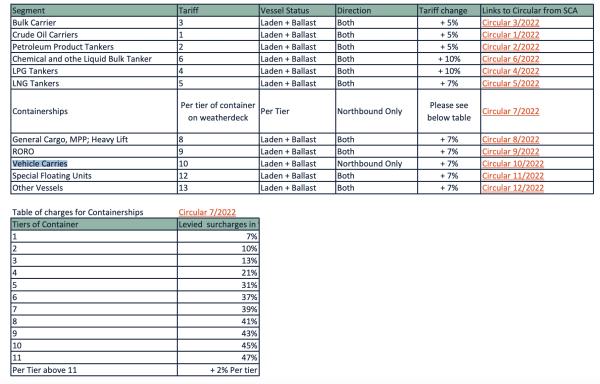 此外,苏伊士运河管理局对北向通行的集装箱船露天甲板上的集装箱层级征收的附加费也有所变更: