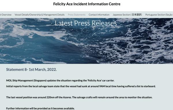 3月1日,“Felicity Ace”轮管理方MOL船舶管理公司(新加坡)援引现场打捞队的初步报告,确认该船于当地时间周二上午9点右舷倾覆,在亚速尔群岛约220海里处沉没。