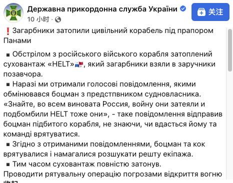 这一事件发生后,“Helt”轮成为了俄乌战争中第一艘遭受攻击且沉没的商船。此前,已有六艘商船遭受不同程度的袭击,导致3名船员重伤,1名船员死亡。
