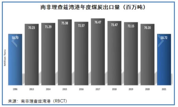 2021年,由于煤矿至码头运输能力受限,南非理查兹湾煤码头(RBCT)煤炭出口量创1997年以来新低,仅5872万吨,较2020年减少近1150万吨,较当年煤炭出口预期7700万吨相差1800余万吨,煤船发运数量也仅645艘,而2017年曾达到907艘。2022年,该码头煤炭出口目标为7000万吨。
