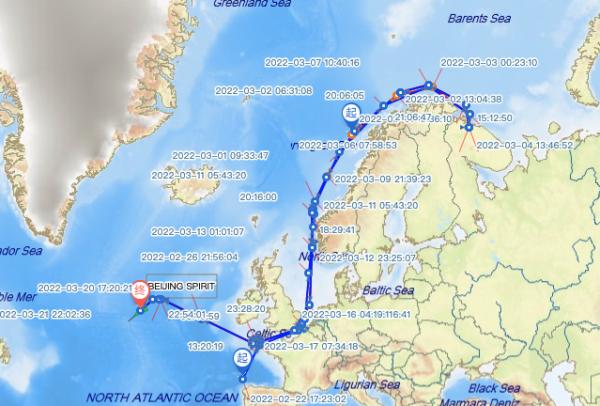Refinitiv Eikon透露,改道的油轮为“Beijing Spirit”轮。该船AIS显示,这艘载有俄罗斯货物的船舶原定前往美国,后改道前往法国,而如今则表示将于3月28日抵达费城。