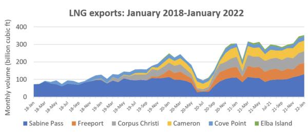 美国的液化天然气出口量每月都在创下新的记录,1月份的出口量达到3535亿立方英尺。RBN能源公司预测,鉴于Cheniere公司Sabine Pass设施的新出口列车和Calcasieu Pass新出口工厂的启动,本月出口量将再创新高。