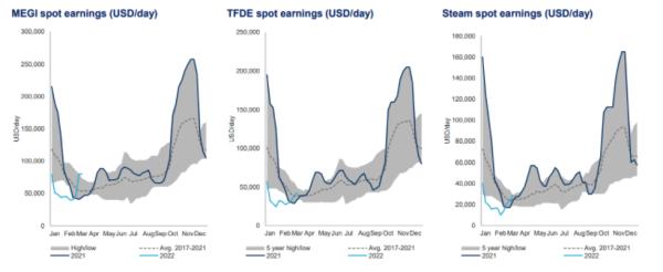 根据Clarksons Platou的数据,周一,三燃料柴油机(TFD)LNG船的现货运费为42500美元/天,虽远远高于2月中旬的低点25,000美元/天,但与2017-21年这个时候的平均水平一致。
