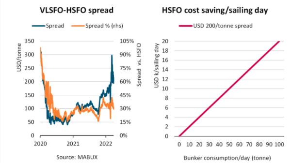 由于俄乌冲突爆发,极低硫燃料油(VLSFO)与高硫燃料油(HSFO)之间的价差继续扩大,近期已稳定在200美元/吨以上。