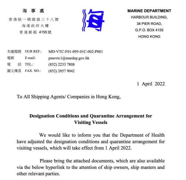 香港海事处在最新给代理的一份通知中指出,需要在香港进行货物操作(船员)以及为转换文件、加油和/或供应(船员)的货船,无论在抵达香港前14天内是否到过台湾/澳门/中国大陆/其他国家和地区,仅需在特定条件下进行医学监测。(特定条件下进行医学监测指船舶抵达香港后,必须每天测量两次体温,并向船公司/代理人报告,如发现船员身体不适立即报告)