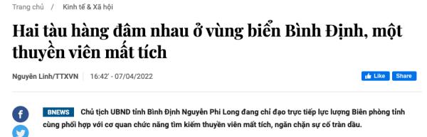 4月7日,一艘集装箱船与一货船在越南平定省会仁镇水域相撞,导致货船沉没,1名船员失踪,2万升轻油泄漏。