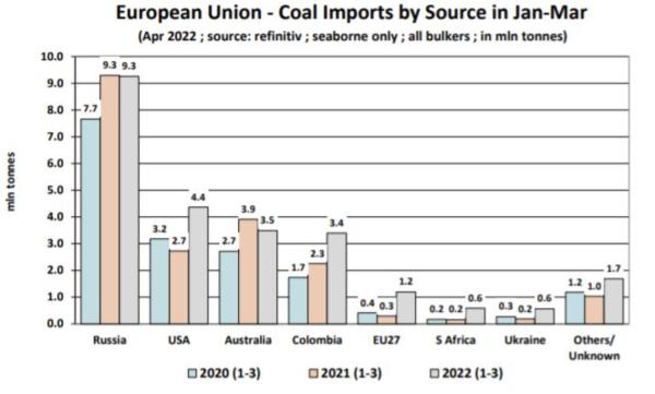 以煤炭进口来源而言,欧盟海运煤炭过去以及现在仍然严重依赖俄罗斯。